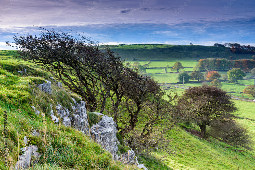 Typical English countryside, close to Buxton, Derbyshire - beautiful green landscape with amazing scenery and blue skies