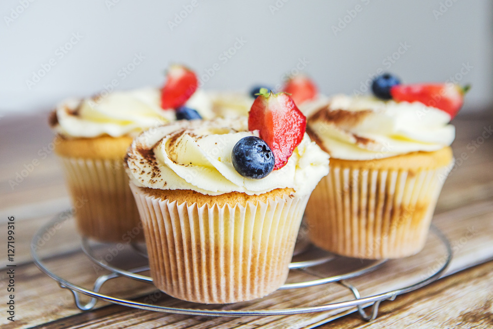 Пирожные с кремом, посыпанным какао, и ягодами клубники и голубики на железной решетке на деревянном столе.
