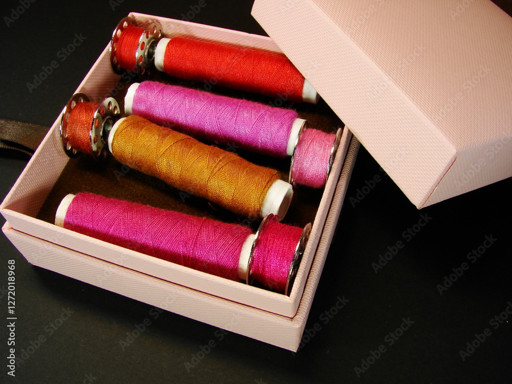 Kolorowe szpule z nićmi ułożone w eleganckim pudełku z przykryciem