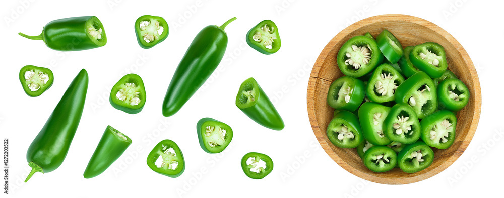 jalapeno peppers in wooden bowl isolated on white background. Green chili pepper . Top view. Flat lay