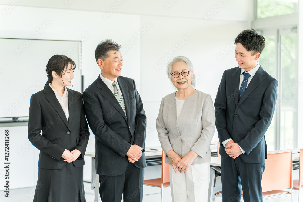 スーツ姿の高齢者・シニアと若者(M&A・後継者・事業継承・跡取り・売却・買収・世代交代)