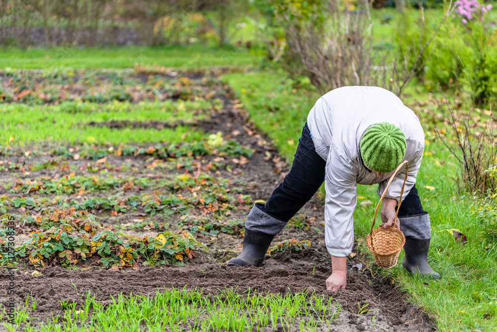 Female gardener planting garlic in the vegetable garden. Autumn gardening.