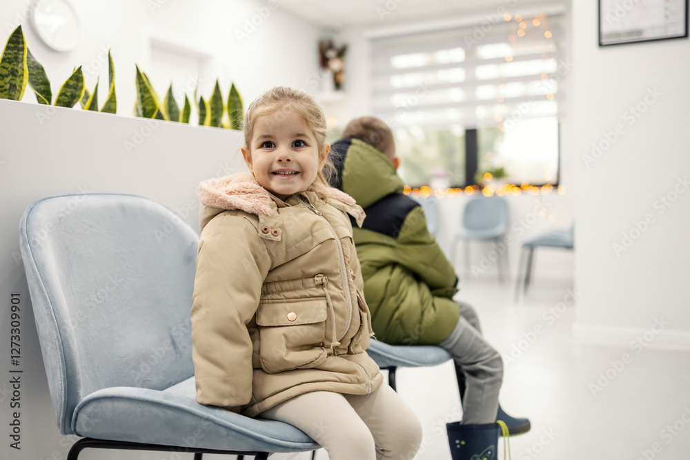 Portrait of a cute little girl sitting in waiting room at hospital with a boy.