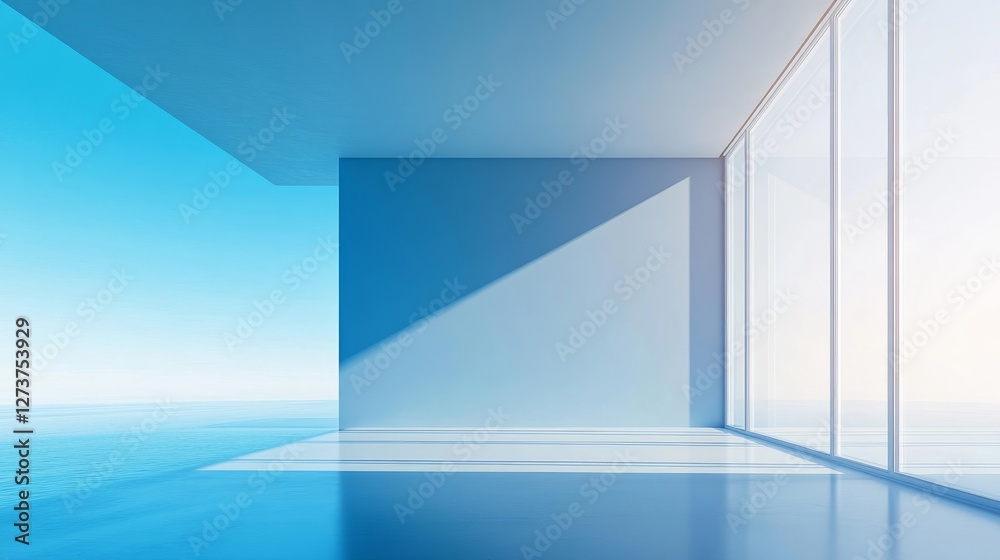 Minimalist designer room with a gradient blue background, elegantly transitioning from deep indigo to light sky blue