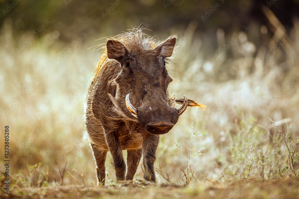 Common warthog walking front view in dry savannah in greater Kruger National park, South Africa ; Specie Phacochoerus africanus family of Suidae