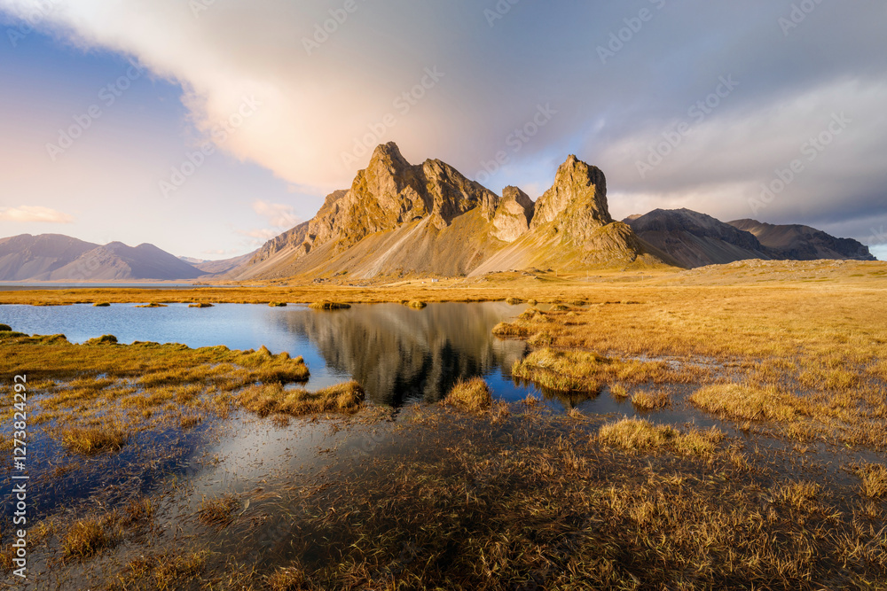 Impressive mountain of Eystrahorn in the South-East of Iceland and a pond with its reflection.
