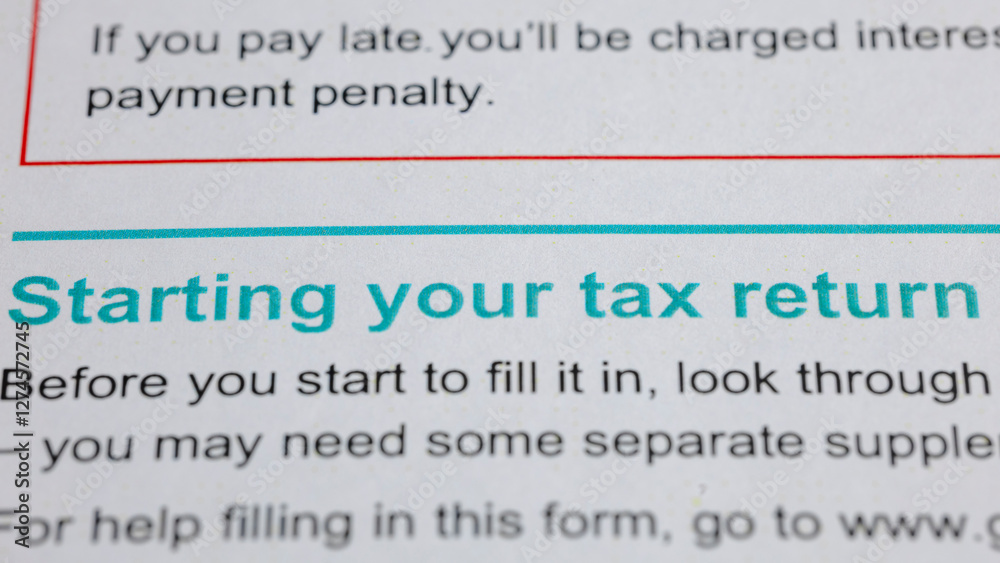Starting your tax return: A close-up view of instructions for completing a tax form, highlighting the initial steps and the potential for late payment penalties.