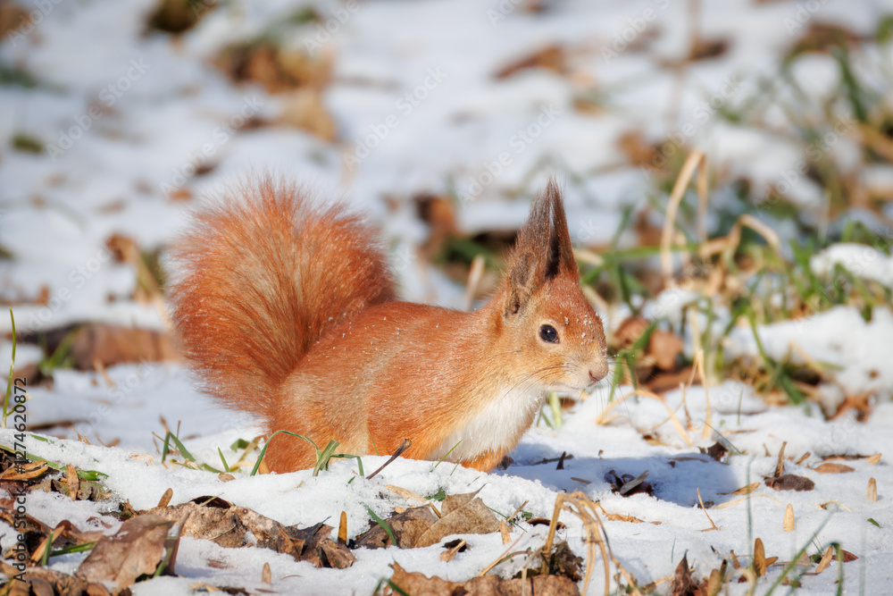 A red fluffy squirrel stands on the ground with snow and looks toward the camera lens on a sunny winter day.