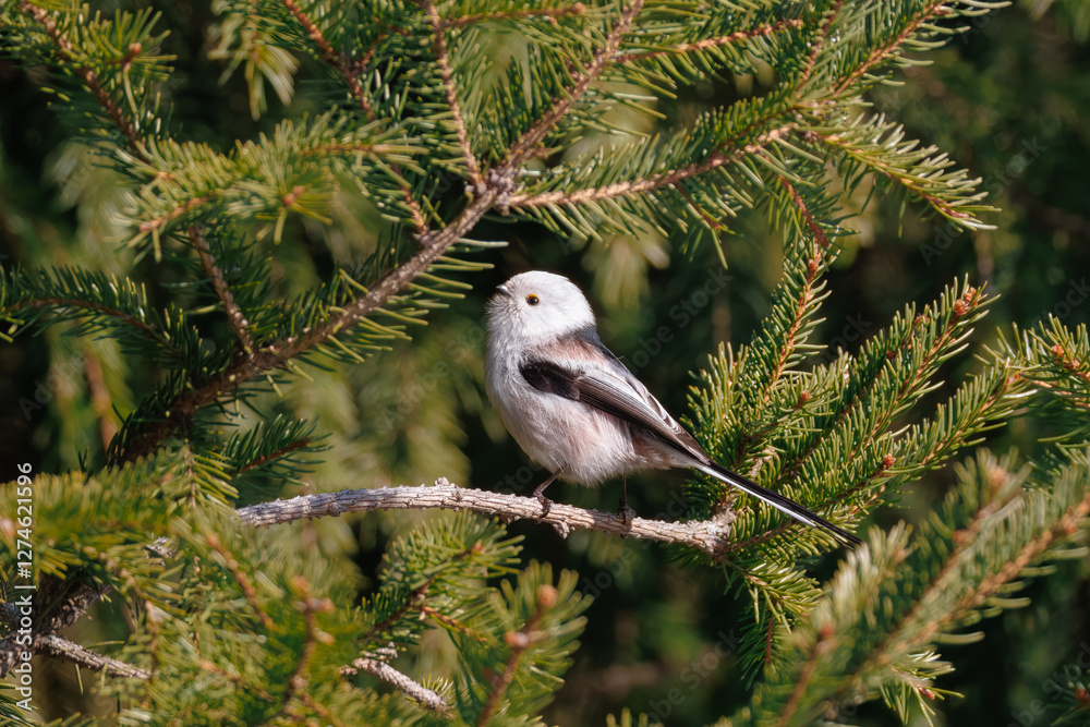 A long-tailed tit sits on the spruce branch perpendicular to the camera lens on a sunny day.