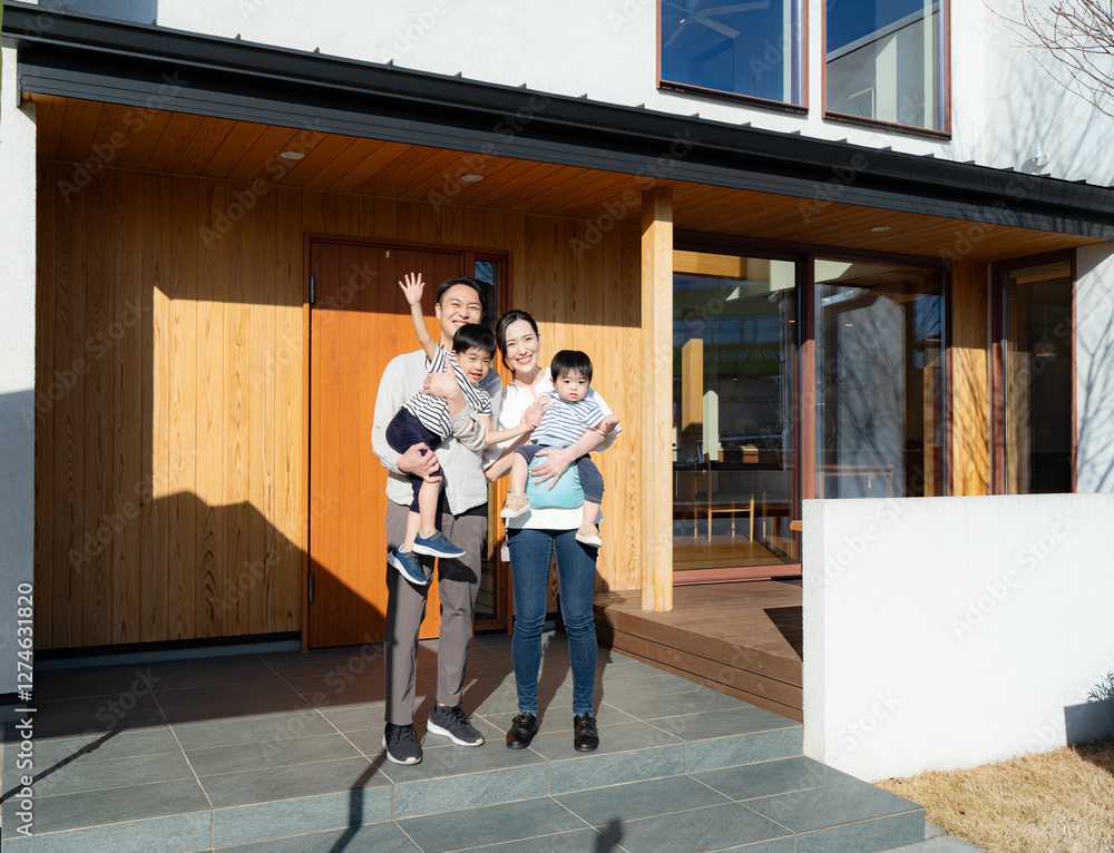 マイホームの前で記念撮影をする4人家族