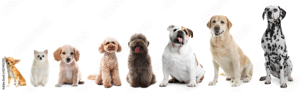 Adorable dogs of different sizes in row on white background, from smallest to largest