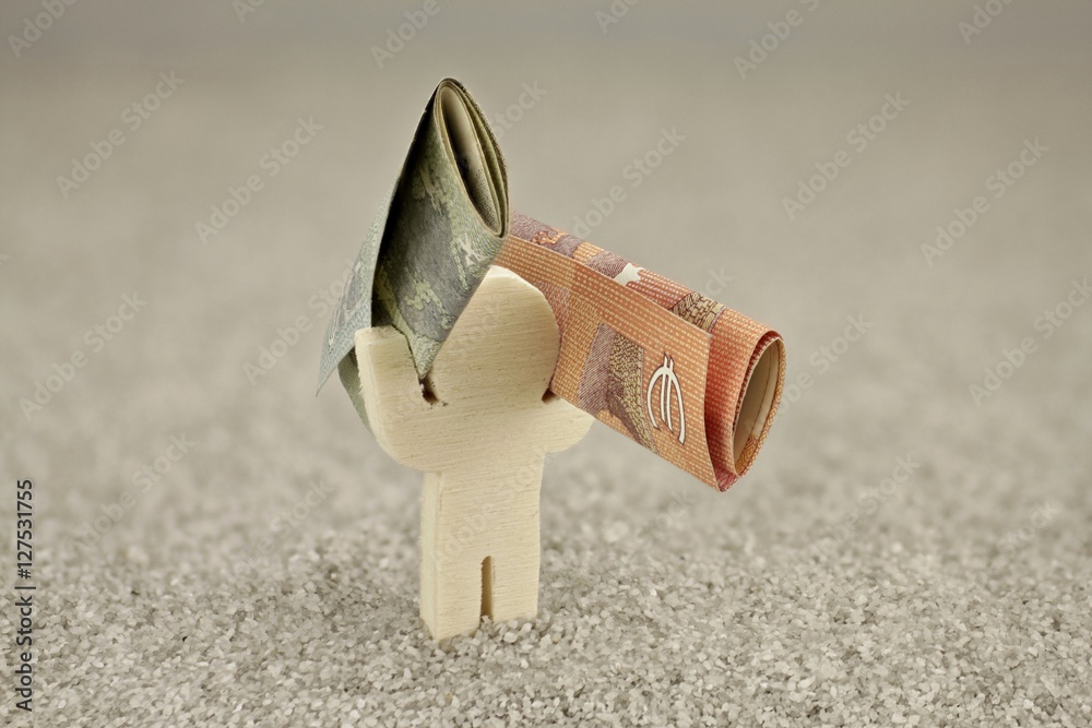 Kleine Figur aus Holz trägt zwei Geldscheine auf den Schultern