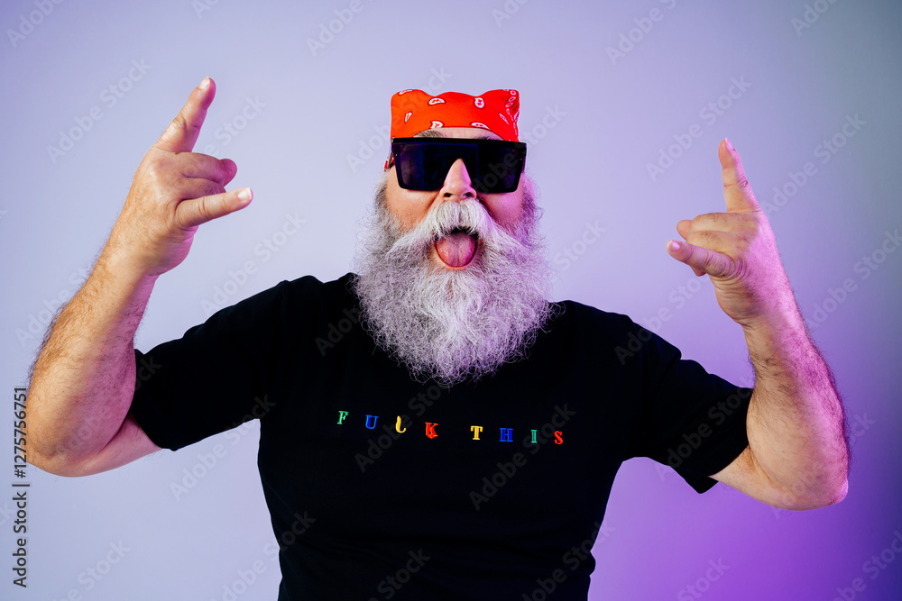 Senior old man with gray beard with biker outfit portrait in studio - Funny stylish older rebel offbeat male adult with cool style, concepts about elderly and lifestyle