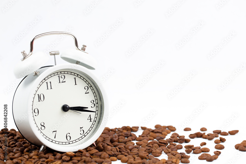 Spring time. Alarm clock and beautiful flowers on grey marble table against yellow background, closeup