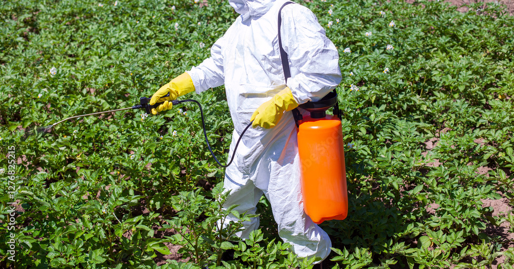 Farmer wearing protective clothing and gloves spraying vegetables with glyphosate herbicide, pesticide or insecticide. Non-organic vegetables.