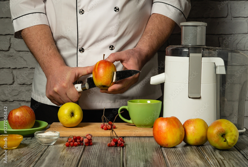 A skilled chef is carefully peeling a red apple, surrounded by fresh fruits and a juicer on the wooden countertop. The warm ambiance creates a welcoming cooking atmosphere