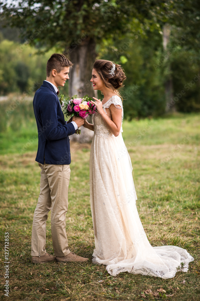 Bride and groom standing in the park, chatting and smiling. Summer time