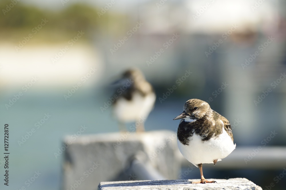 Shore bird resting on a cement pillar at fishing pier.