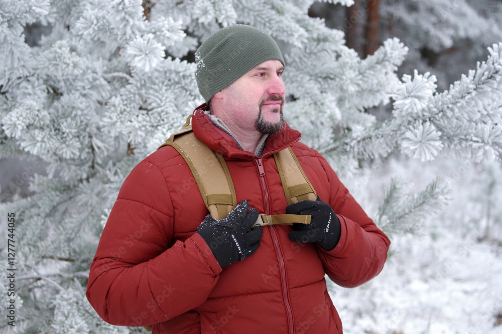 A traveler in a crimson down jacket, equipped with a backpack, stands amidst the snowy woods. A hiker revels in the winter landscape.