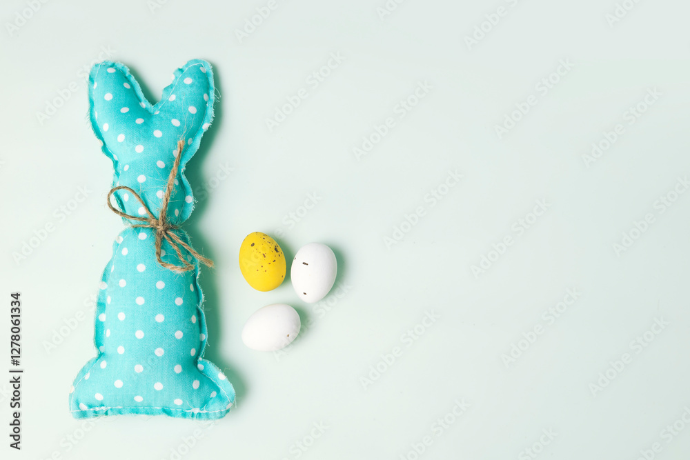 Textile craft handmade bunny and eggs empty copy space. Easter holiday background.