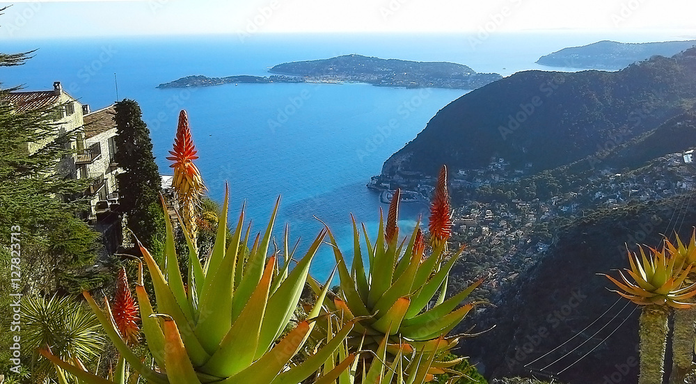 Beautiful view of the village of Eze, a botanical garden with cacti, aloe. Mediterranean, French Riviera