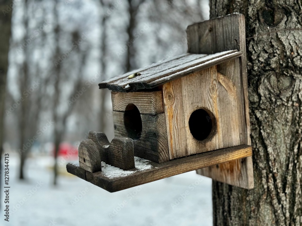 Wooden Birdhouse Hanging in Snowy Landscape