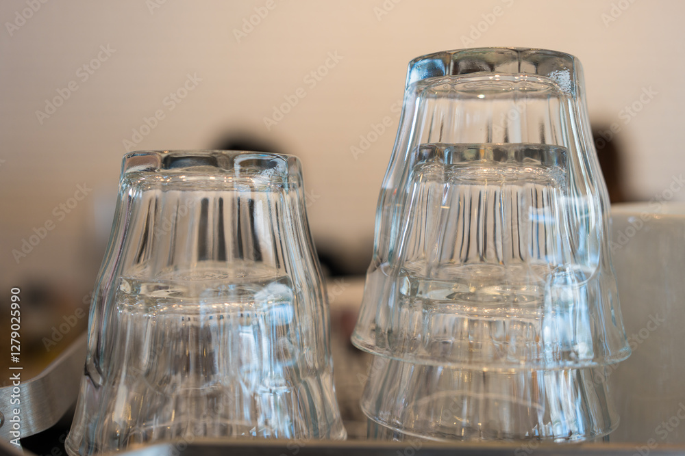 Clean glass lie upside down on a coffee machine in a cafe.