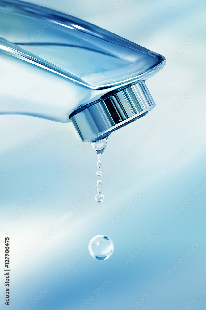 Water droplets drip flowing from chrome faucet in the sink in the kitchen or in the bathroom close-up macro on a blue background. The concept of the idea of saving water and hygiene.