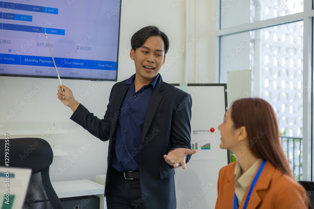 Three people are sitting at a table with a laptop open. One of them is laughing while the other two look on. The man in the middle is giving a presentation to the other two