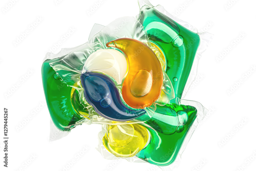 Laundry capsule detergent pods for washing clothes isolated on white background. Top view