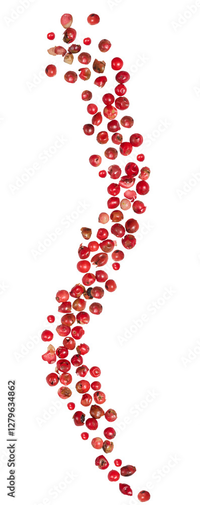 A collection of pink peppercorns arranged in a curved pattern on isolated background