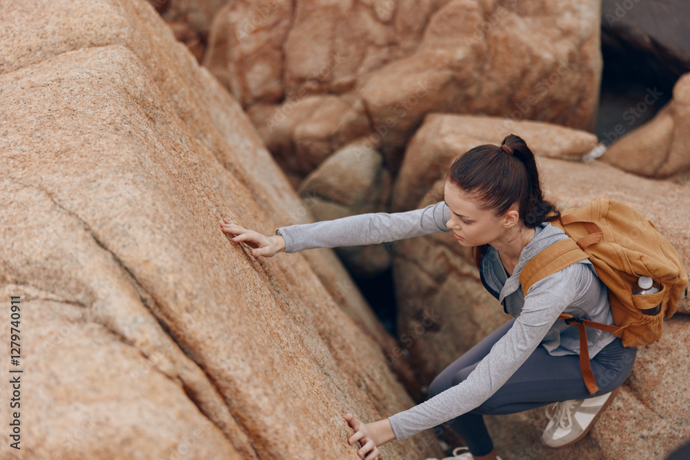 A determined young woman climbing a rocky surface during outdoor adventure, showcasing strength, perseverance, and nature s beauty in a vibrant outdoor setting
