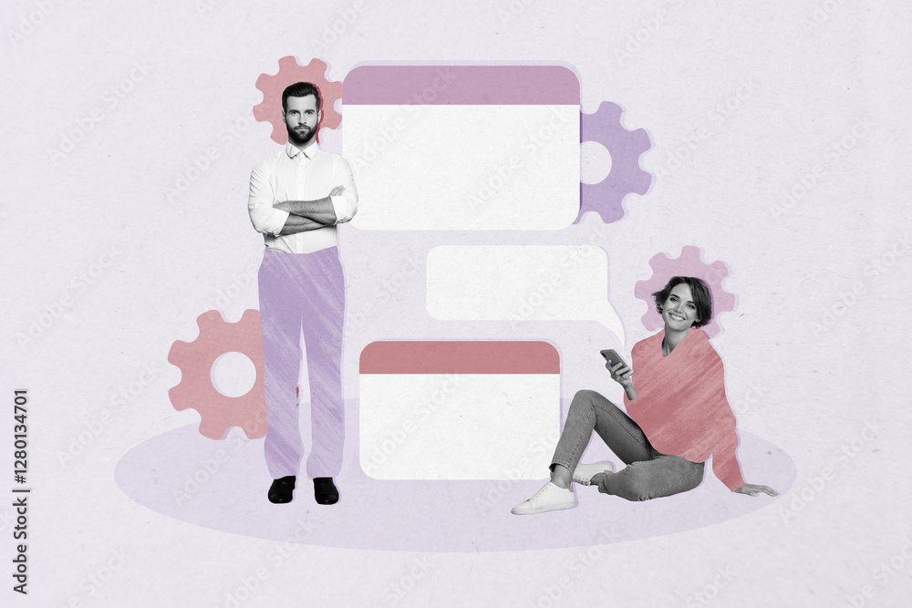 Sketch composite 3D photo collage artwork of young man stand lady smile hold smartphone chatting website speech cloud cogwheel cooperation
