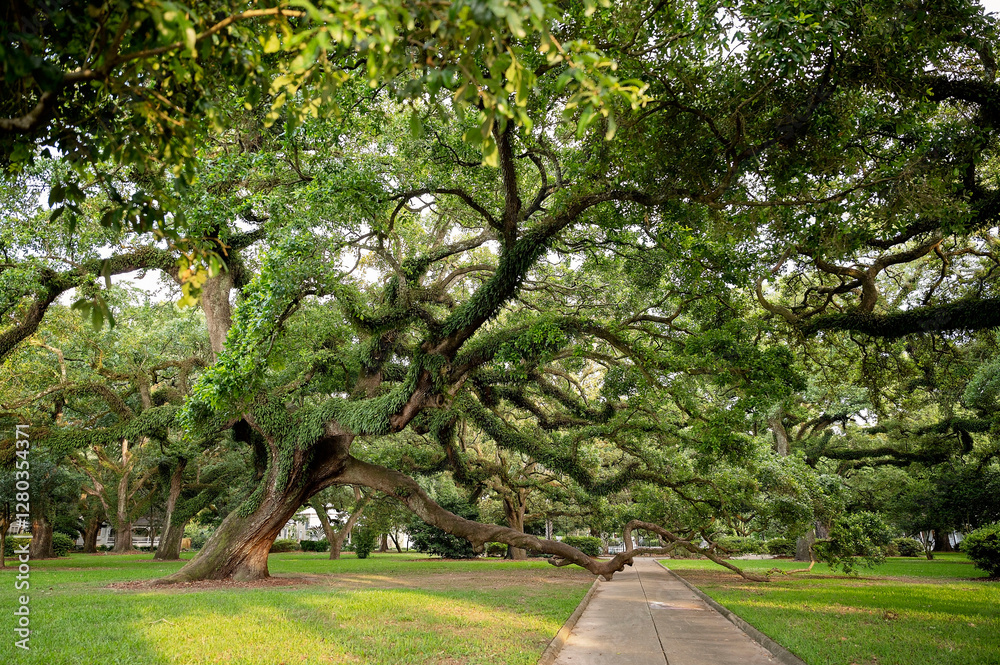 Majestic oak tree with sprawling branches over a park walkway