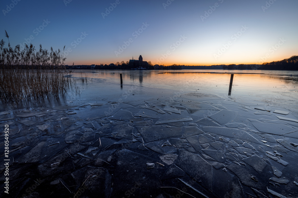 Dome of Ratzeburg in Winter at sunset with sheets of ice in foreground, Schleswig-Holstein, Northern Germany