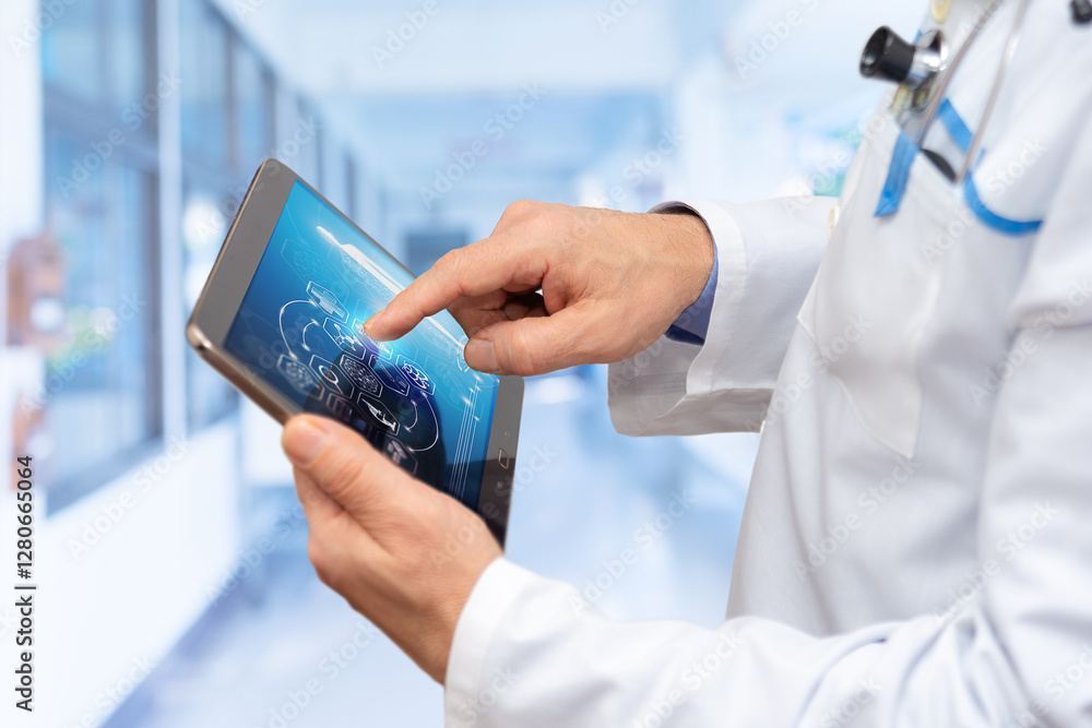 Doctor interacts with digital tablet in modern medical facility showcasing advanced technology and patient care