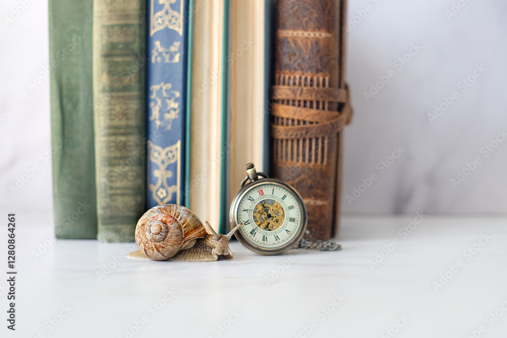 snail, retro pocket watch and old books on table, close up. Relax time, harmony of nature. inspiration composition, dreamy artistic image. snail symbol of slow life, deadline