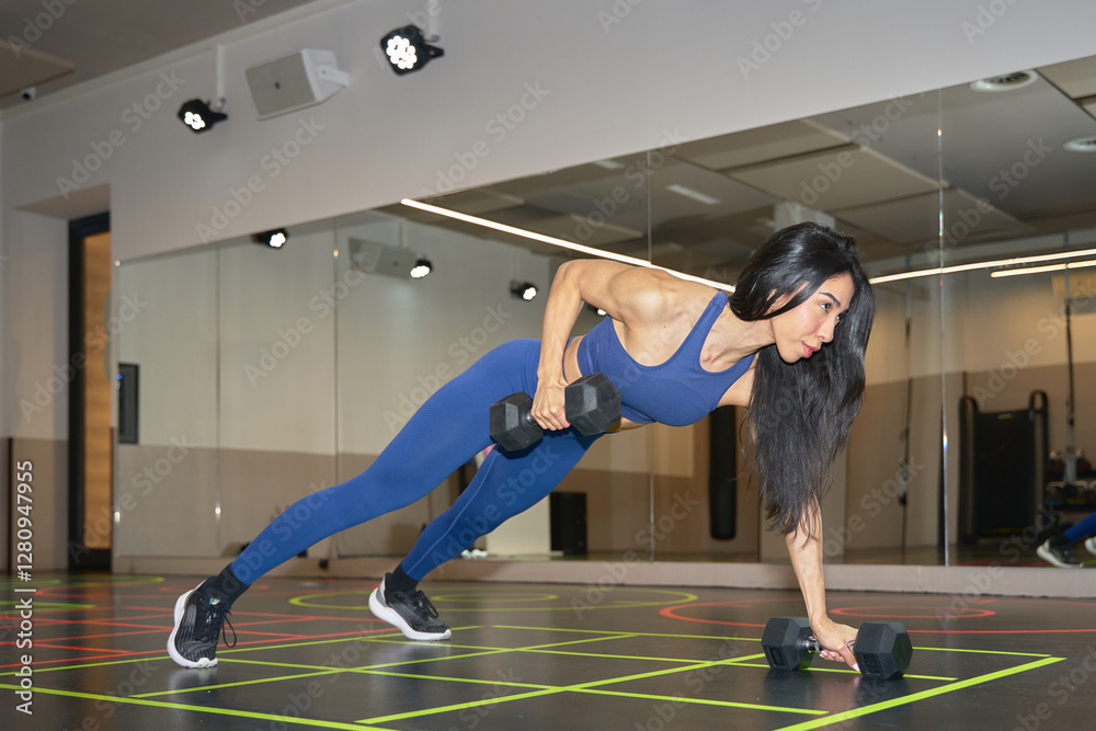 Determined sportswoman doing renegade rows with dumbbells in gym