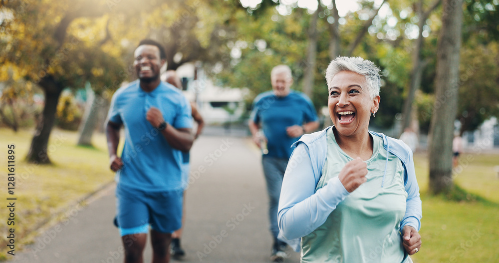 Senior, woman and running for fitness outdoor of mobility training, exercise and morning routine. Elderly, people and coach with challenge, workout support and cardio performance for wellness at park