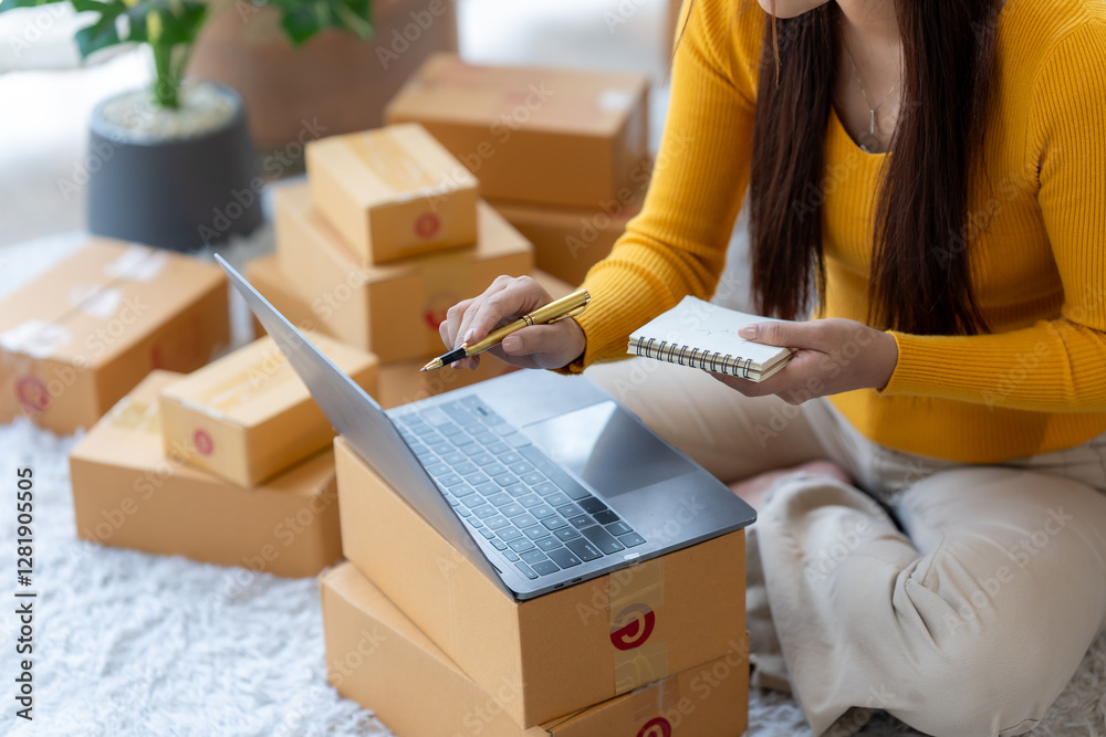 E-commerce Startup: An entrepreneur, surrounded by shipping boxes, meticulously manages online orders and business plans on a laptop. Capturing the essence of startup life.