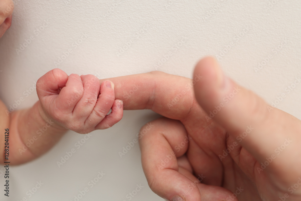 Close-up little hand of child and palm of mother and father. The newborn baby has a firm grip on the parent's finger after birth. A newborn holds on to mom's, dad's finger.