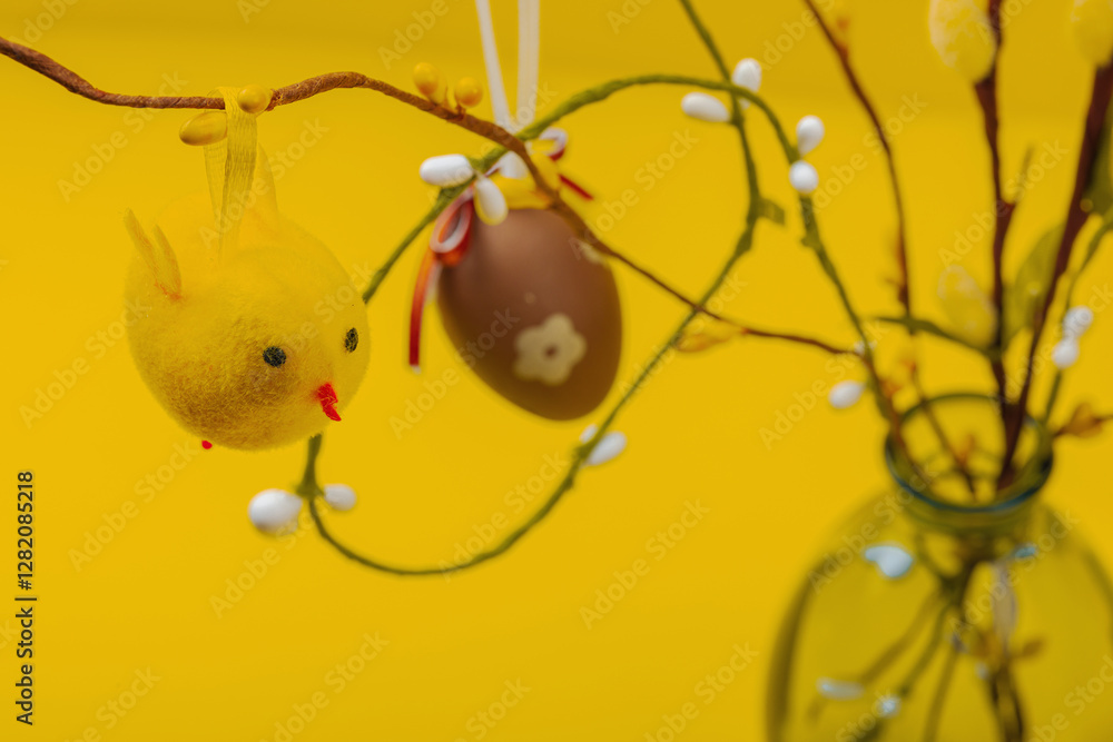 Traditional Easter tree composition with willow branches, handmade eggs and birds. Bright yellow