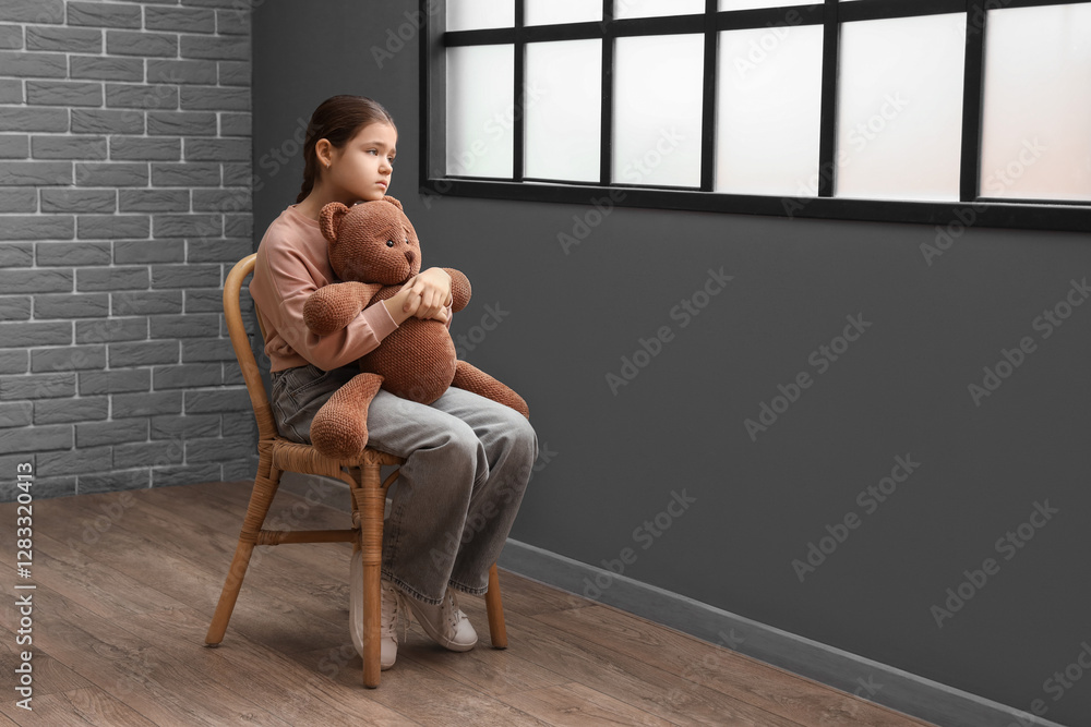 Sad girl with toy bear sitting on chair in room. Adoption concept