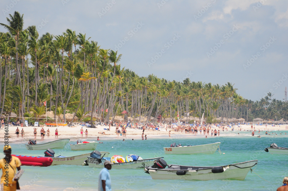 Punta Cana, La Altagracia, Domenican Republic. May 09, 2012: Crowded Punta Cana beach lined with palm trees and boats.