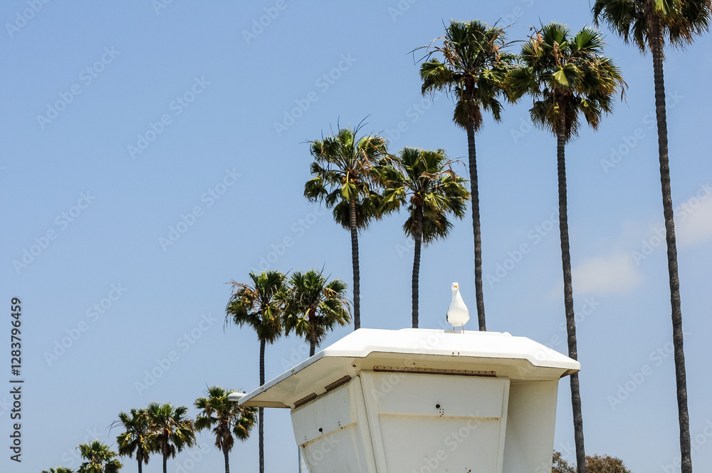 Seagull on lifeguard tower under palm trees at serene beach with blue sky
