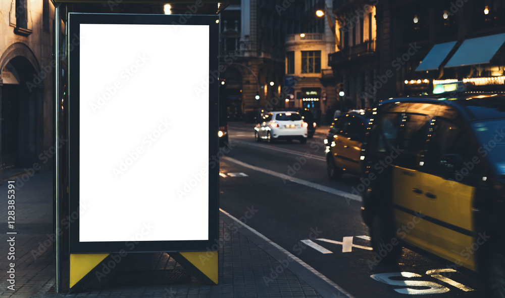 Blank advertising light box on bus stop, mockup of empty ad billboard on night station, template banner on background city street for text in Barcelona, afisha board and headlights of taxi cars