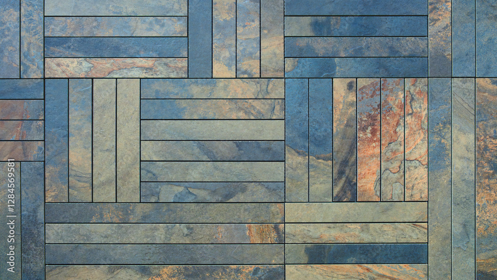 A blue and brown tile floor with a pattern of squares and rectangles. The tiles are arranged in a way that creates a sense of depth and texture. Scene is one of warmth and coziness