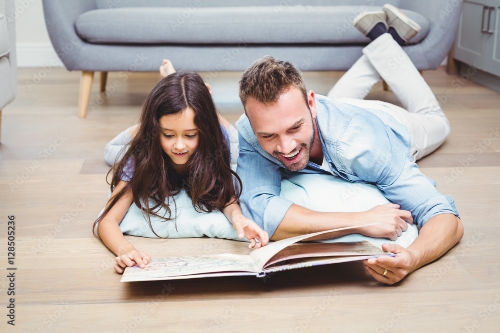 Father and daughter looking in picture book on floor