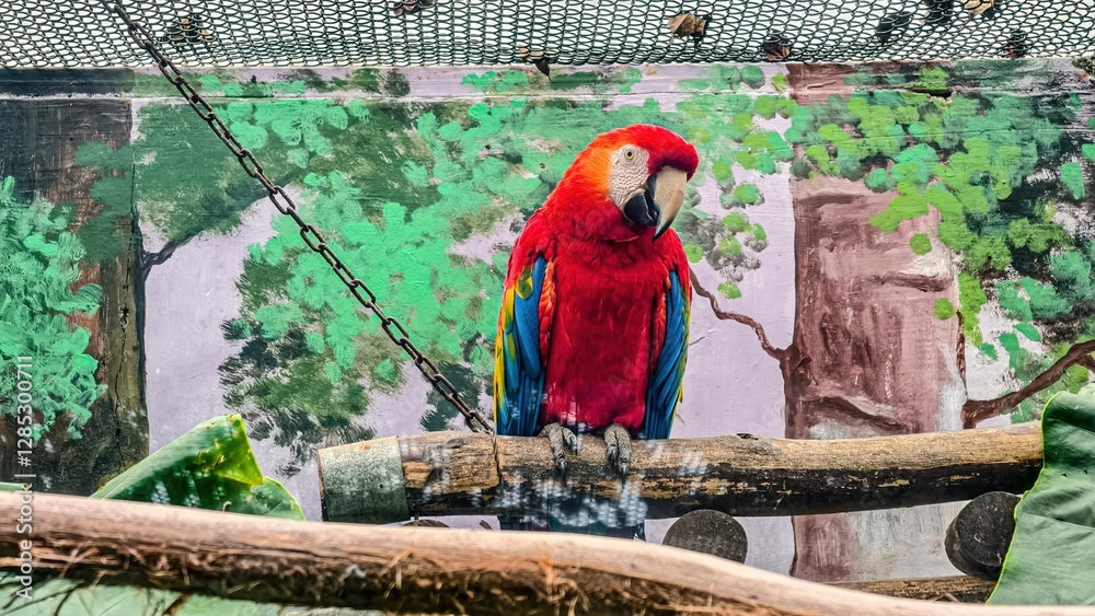 Vibrant scarlet macaw perched peacefully on a branch in an enclosure