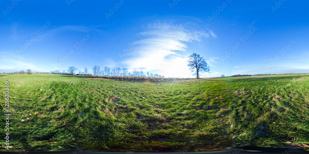 360 degrees spherical panorama of green fields and blue sky in autumn